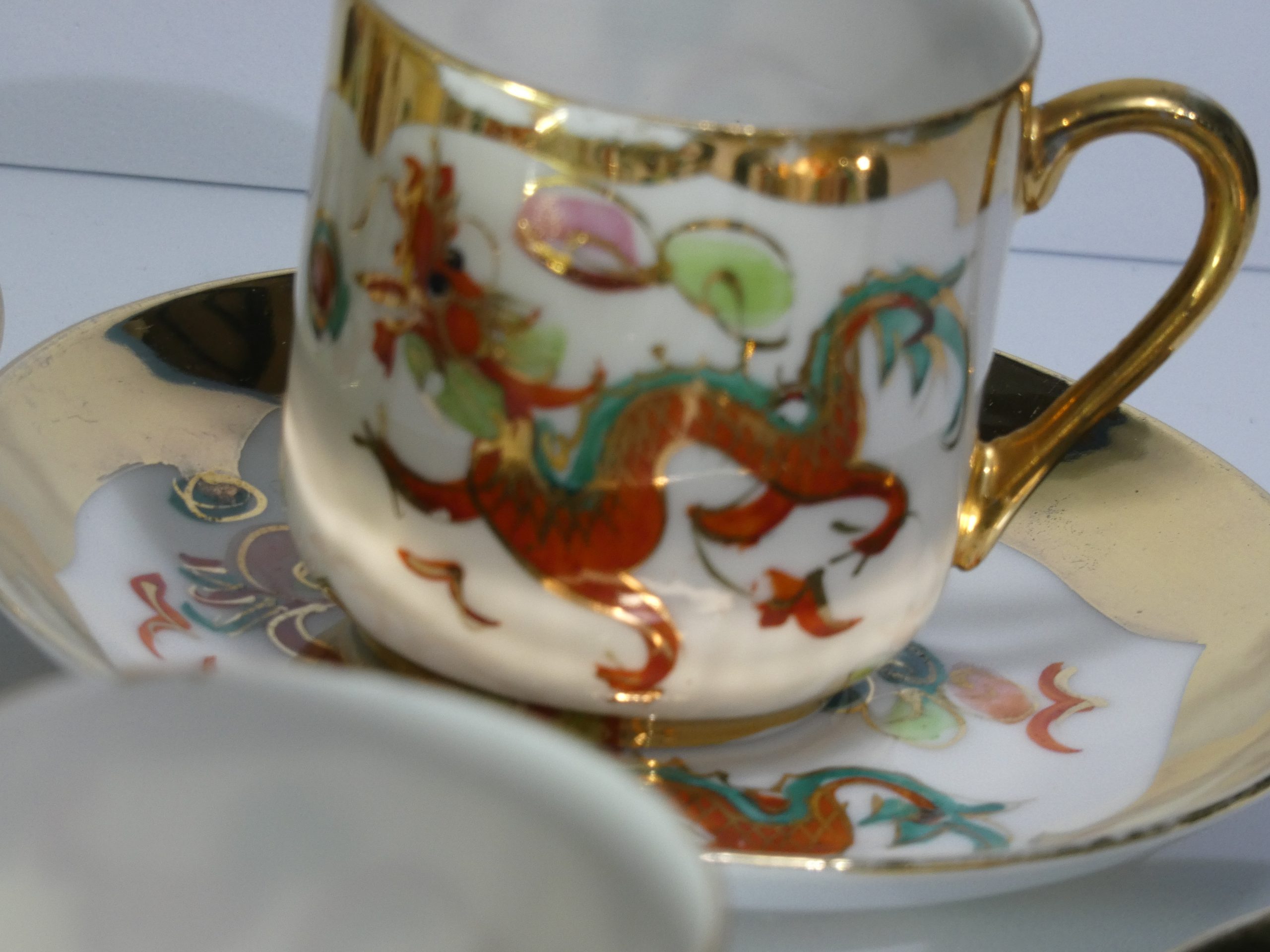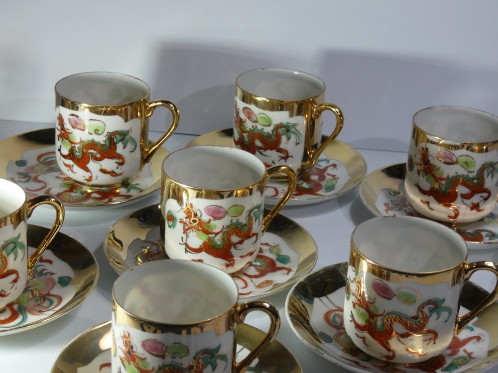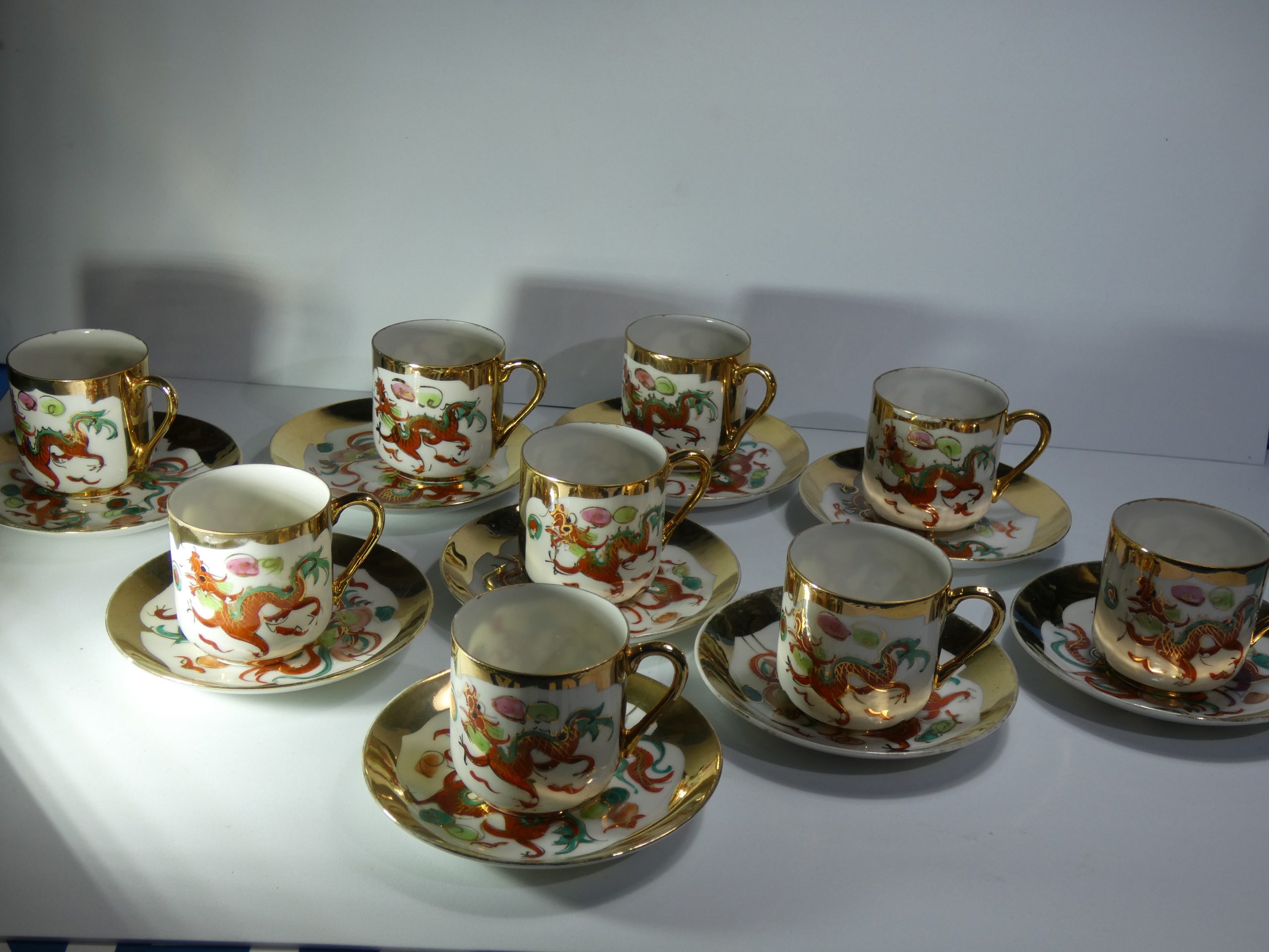 9 tazas y platos de porcelana china años 50. decorada a mano.