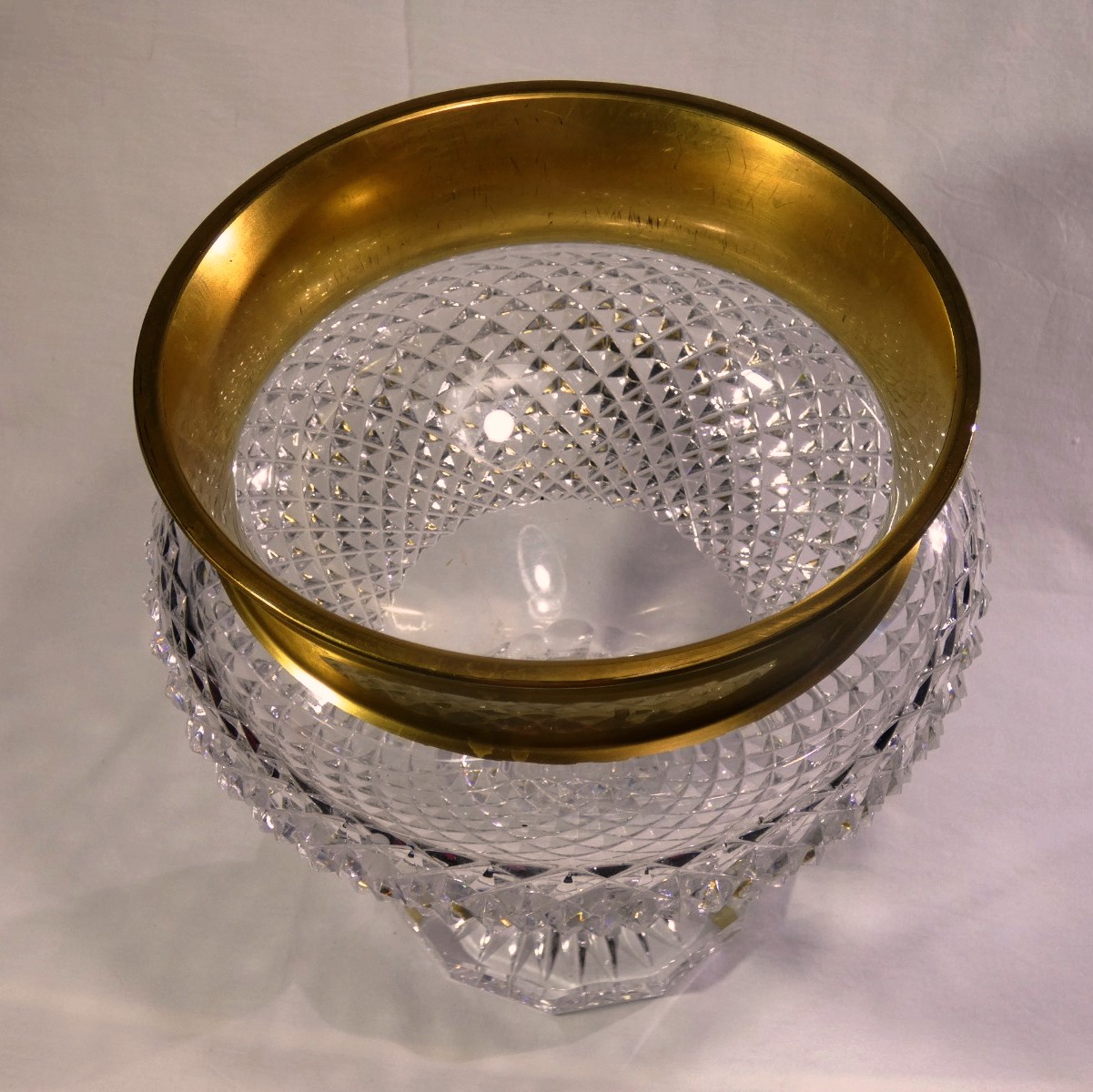 Precioso centro de cristal tallado y borde laminado en oro. Mide 24 cm de alto y 22 cm de diámetro.