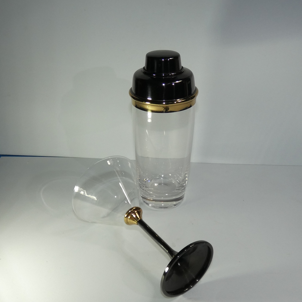 Coctelera, cinco copas y bandeja a juego.