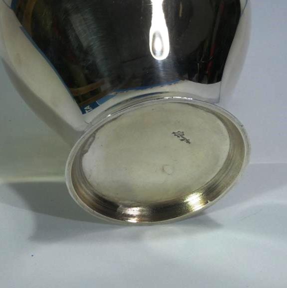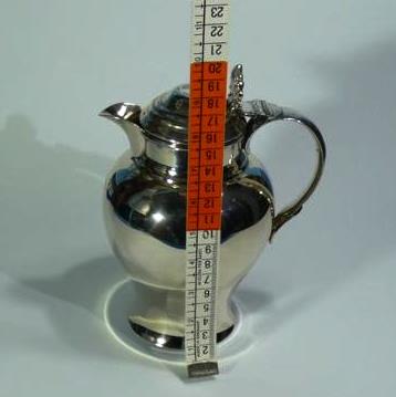 Es de latón plateado y mide 20 cm de altura x 10 cm de diámetro