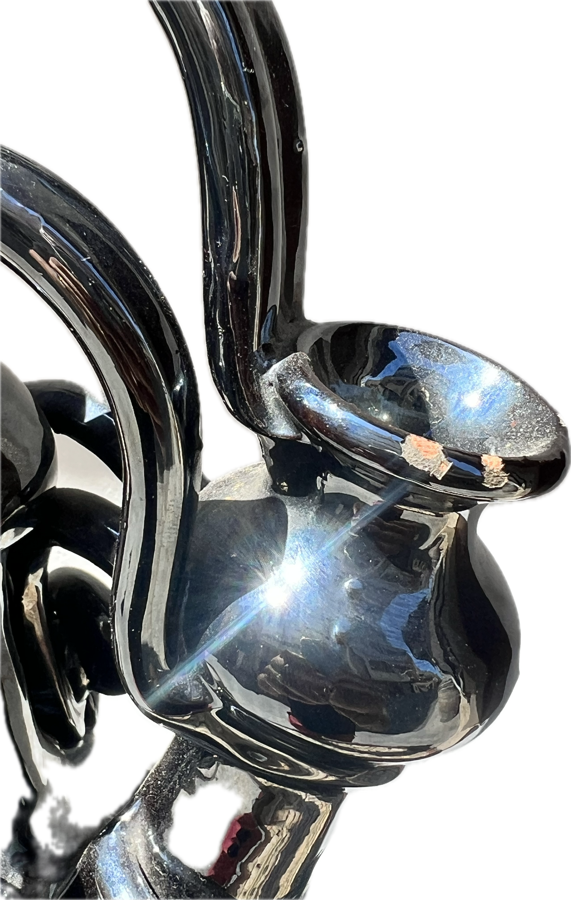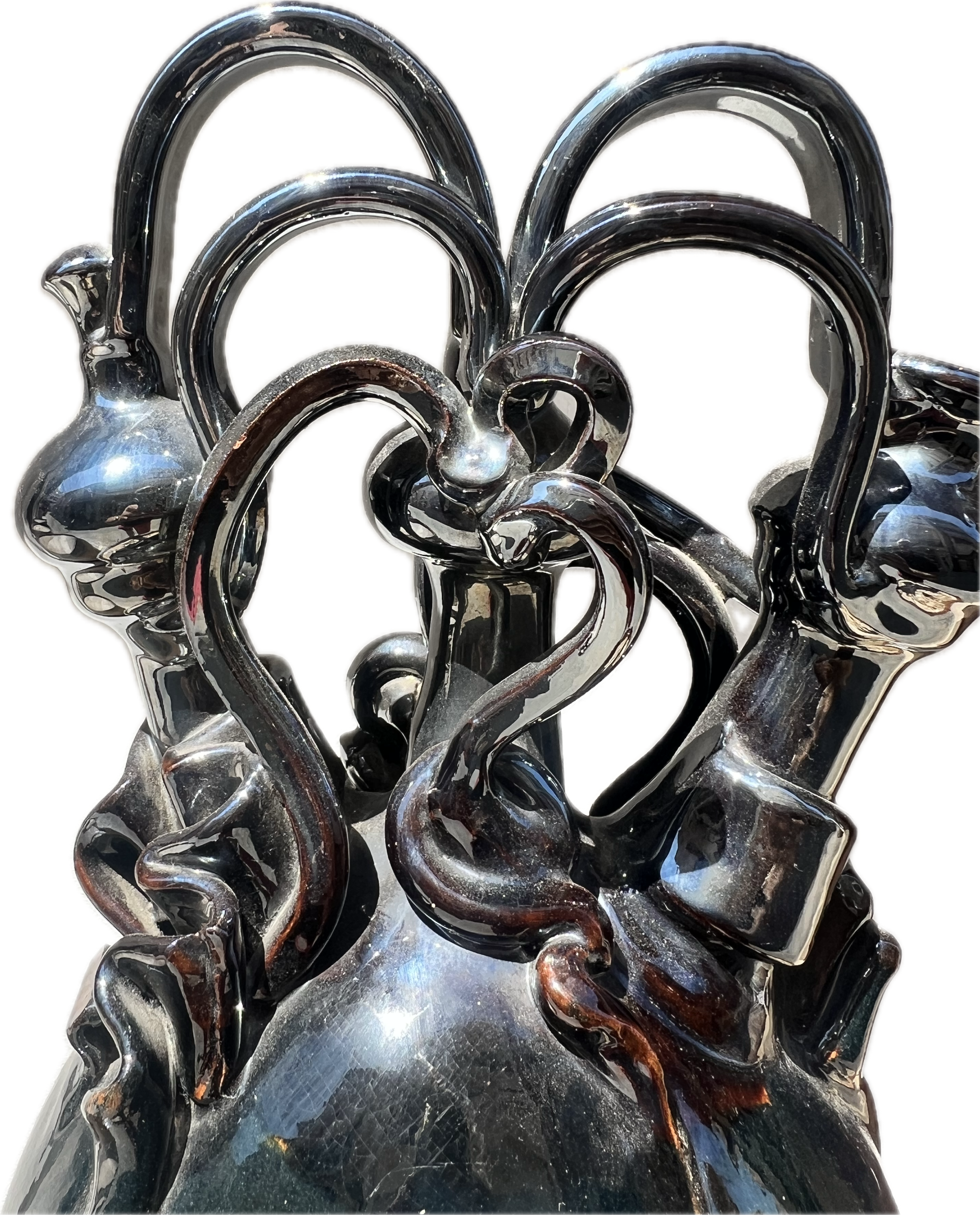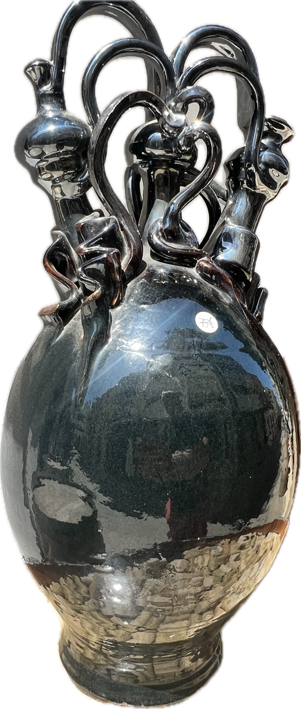 Bonito jarrón de cerámica hecho a mano con algún desperfecto se puede reparar fácilmente . Color gris oscuro. Desconozco los años que tiene .