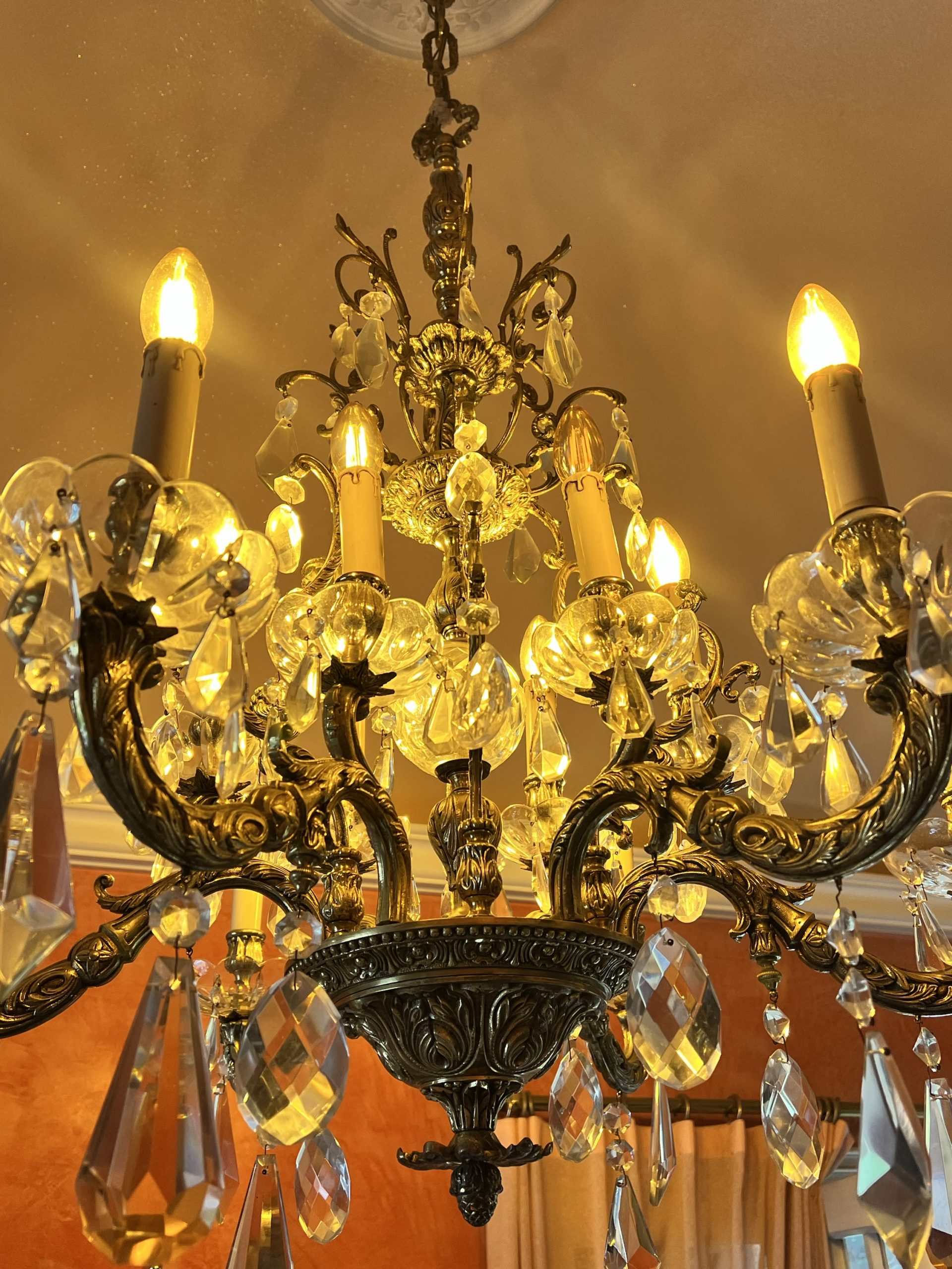 Espectacular lampara de bronce y cristal Año 40. En Perfecto estado de conservación. Ultima restauración Años 90. Barnizado el bronce y cableado nuevo.
