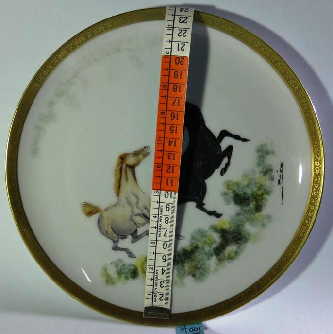 Se trata de uno de los dos platos decorados a mano con motivos equinos por la prestigiosa casa austríaca Hutschenreuther. Datan de los años 50.