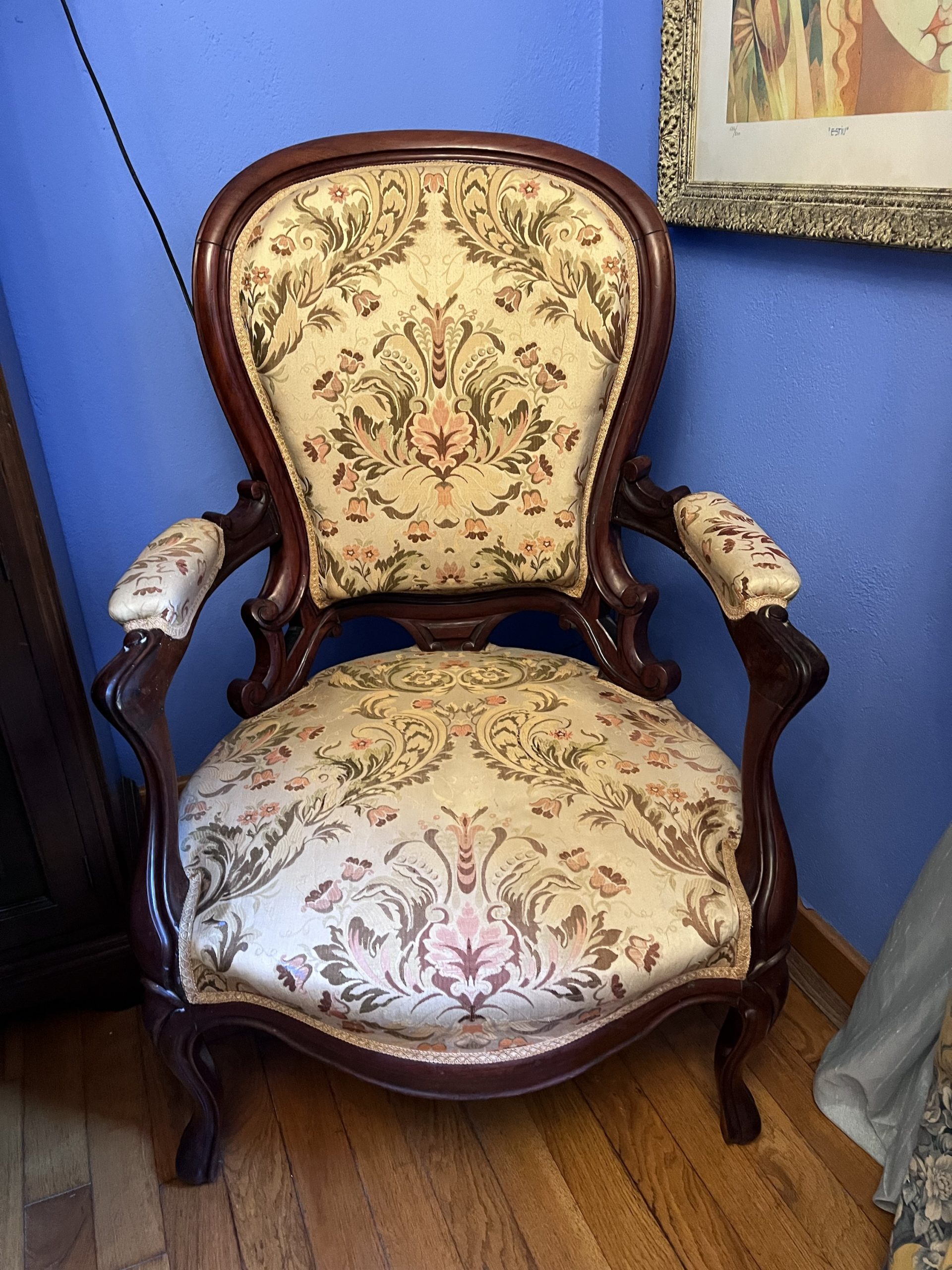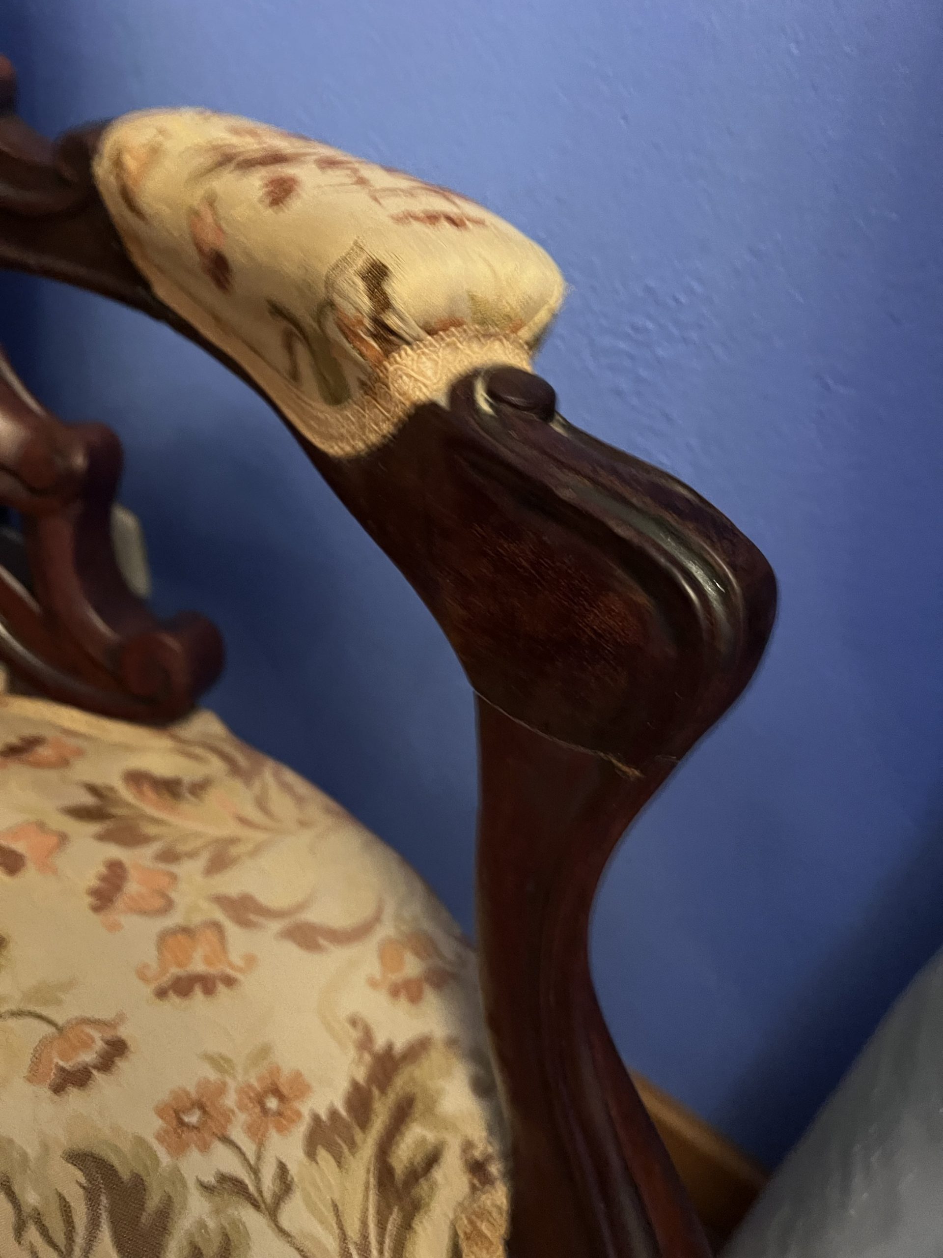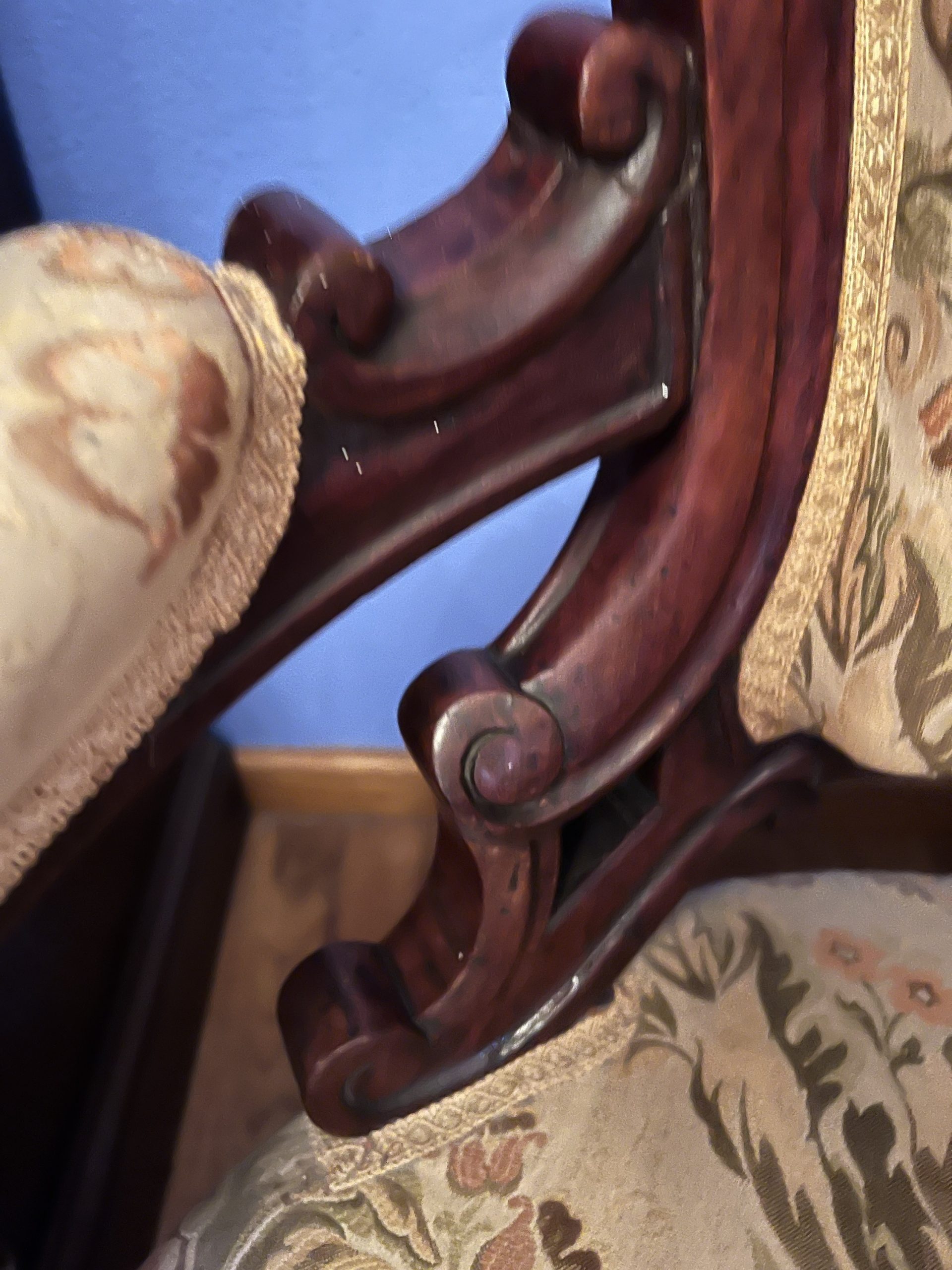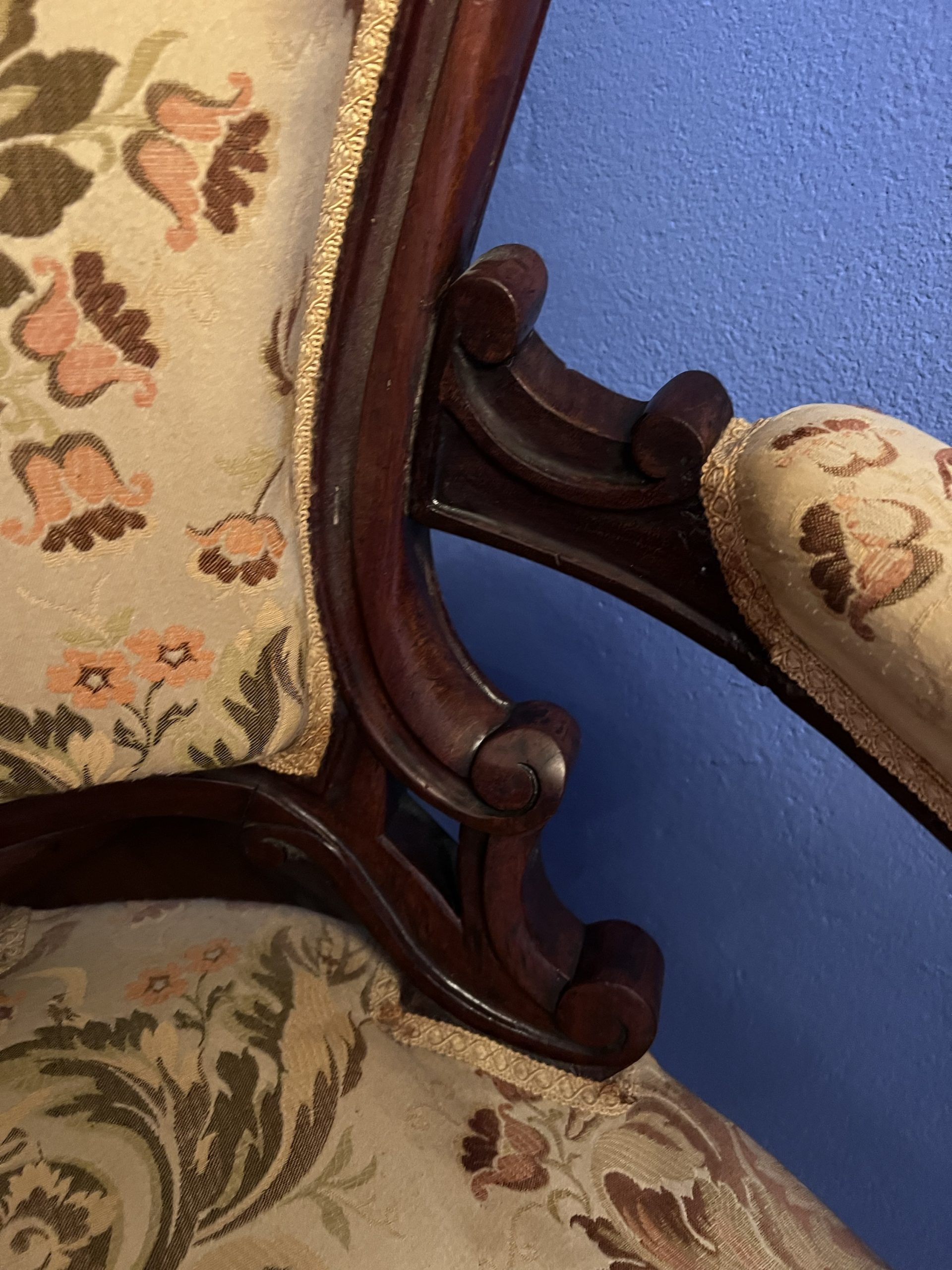 Este exquisito sillón Isabelino de madera de nogal, tallado a mano, es una verdadera joya de herencia familiar. Con sus dimensiones de 110cm de altura, 68cm de ancho y 61cm de fondo, combina a la perfección la elegancia del estilo Isabelino con la artesanía detallada. La madera de nogal le confiere una rica calidez, mientras que la tela de primera calidad, súper bien conservada, añade un toque de lujo. Este sillón no solo es una pieza de mobiliario, sino un legado que ha perdurado a lo largo de generaciones, llevando consigo historias y recuerdos que enriquecen su valor.